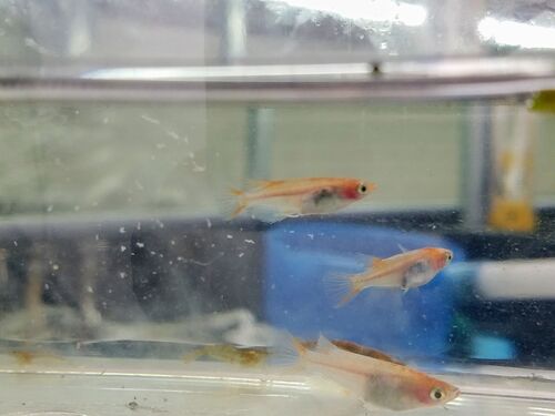 #三色メダカ 11月23日と24日の二日を使って行った水換え。三色メダカ容器も水換え対象です。水換えのためにメダカを別容器に移しました。_(°ω°」 ∠)_三_(°ω°」 ∠)_三 ザッザッ ((゜ㅇ゜)??? アレェ?ズームアップ! 3匹とも♂…………… それじゃ卵を産まないよチ───(´-ω-…